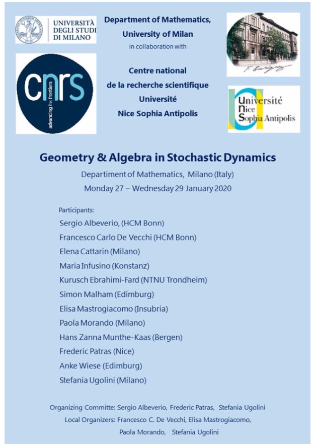 • Workshop "Geometry & Algebra in Stochastic Dynamics" (poster), January 27-29, 2020, Department of Mathematics, University of Milan, Milan, Italy.
